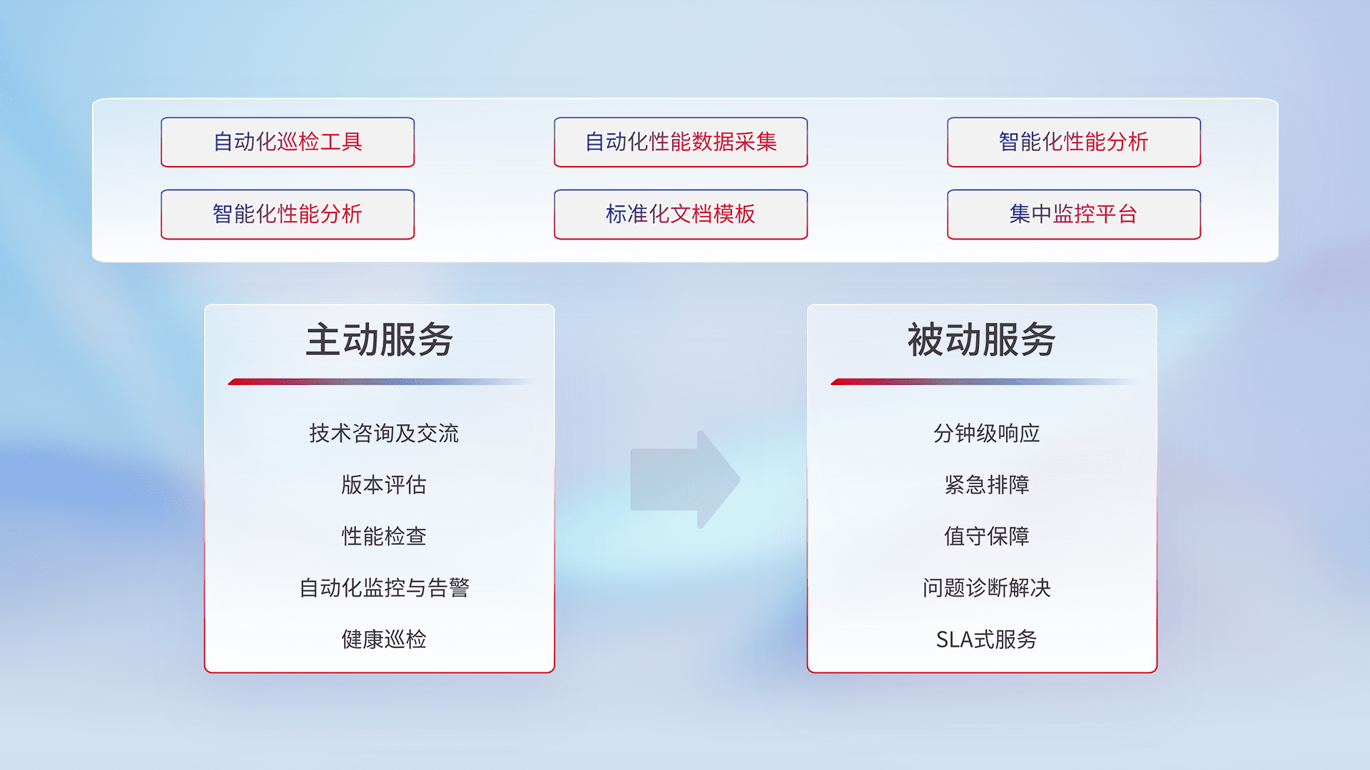 智能化工具和标准化文档,,保障服务质量,,,提供主动服务(包含技术咨询、、版本评估、、、性能检查、、自动化监控与告警、、健康巡检)和被动服务包含(分钟级响应、、紧急排障、、、值守保障、、、、问题诊断解决、、SLA服务)。。